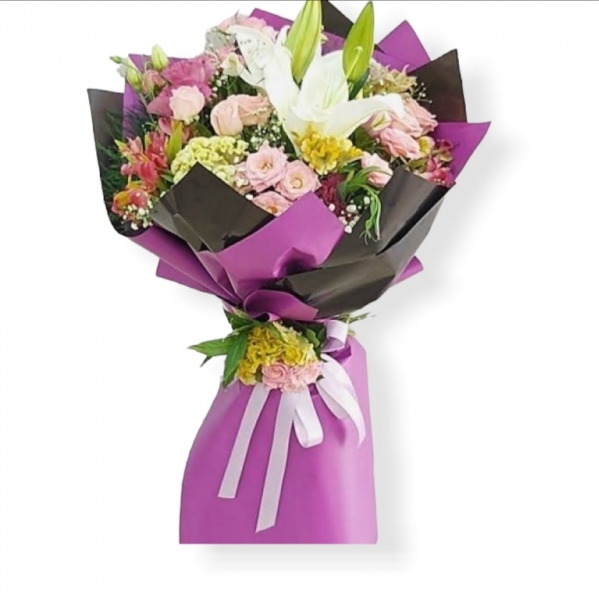 Mis kokulu lilyum ve mevsim çiçekleri buketi